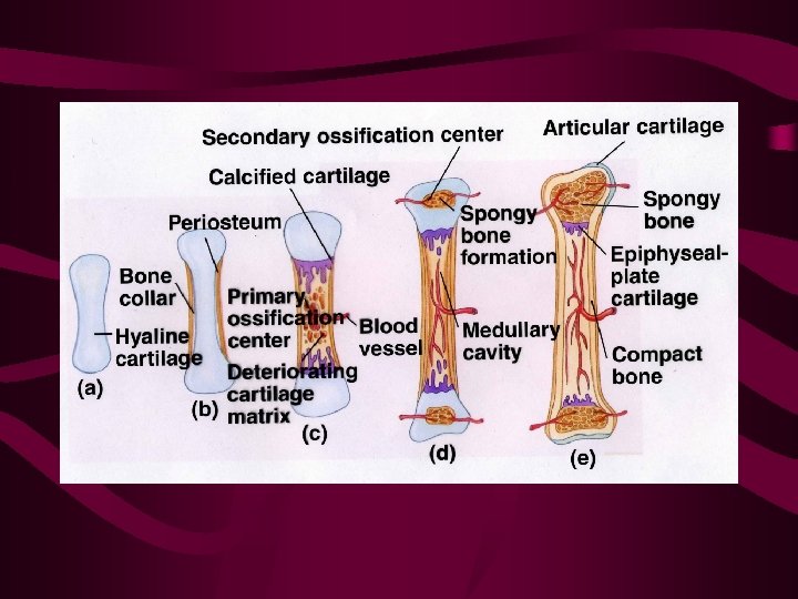 Bone Growth III • Primary ossification center as cartilage is replaced by spongy bone