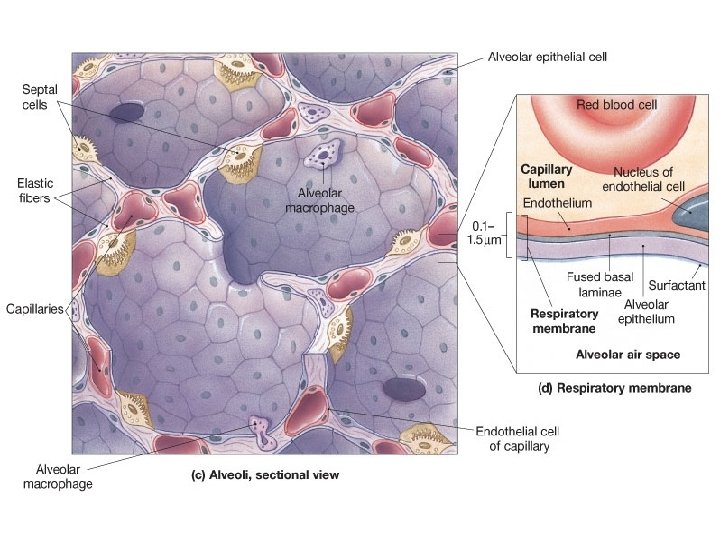 Alveoli also have elastic fibers Elastic recoil - pushes air out (assists ventilation). Capillaries cover 90% of alveolar surface.