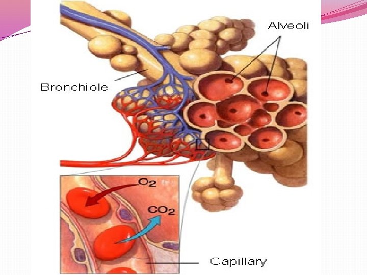Gas Exchange �After air enters the alveoli, oxygen passes through the wall of the alveoli and through the wall of a tiny blood vessel. Carbon dioxide and water pass from the blood into the alveoli.