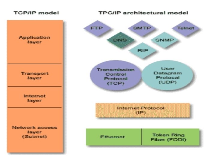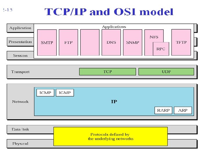 • The three top most layers in the OSI model, however, are represented in TCP/IP by a single layer called the Application layer (Session, Presentation and Application layer). • At the Transport layer, TCP/IP defines three protocols: Transmission Control Protocol (TCP), User Datagram Protocol (UDP), and Stream Control Transmission Protocol (SCTP). • At the Network layer, the main protocol defined by TCP/IP is the Internetworking Protocol (IP). • Internet layer also called Network layer. • Host to network layer is also called Physical and Data link layer.