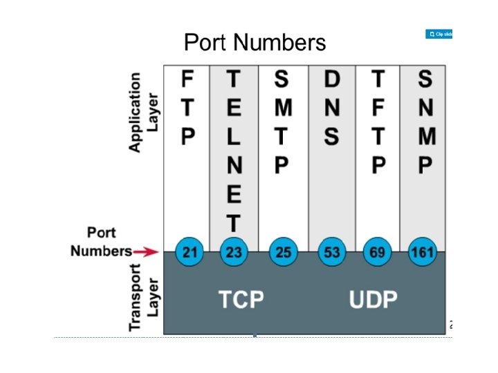 Services • 21: File Transfer Protocol (FTP) • 22: Secure Shell (SSH) • 23: Telnet remote login service • 25: Simple Mail Transfer Protocol (SMTP) • 53: Domain Name System (DNS) service • 80: Hypertext Transfer Protocol (HTTP) used in the World Wide Web • 110: Post Office Protocol (POP 3) • 119: Network News Transfer Protocol (NNTP) • 123: Network Time Protocol (NTP) • 143: Internet Message Access Protocol (IMAP) • 161: Simple Network Management Protocol (SNMP) • 194: Internet Relay Chat (IRC) • 443: HTTP Secure (HTTPS)