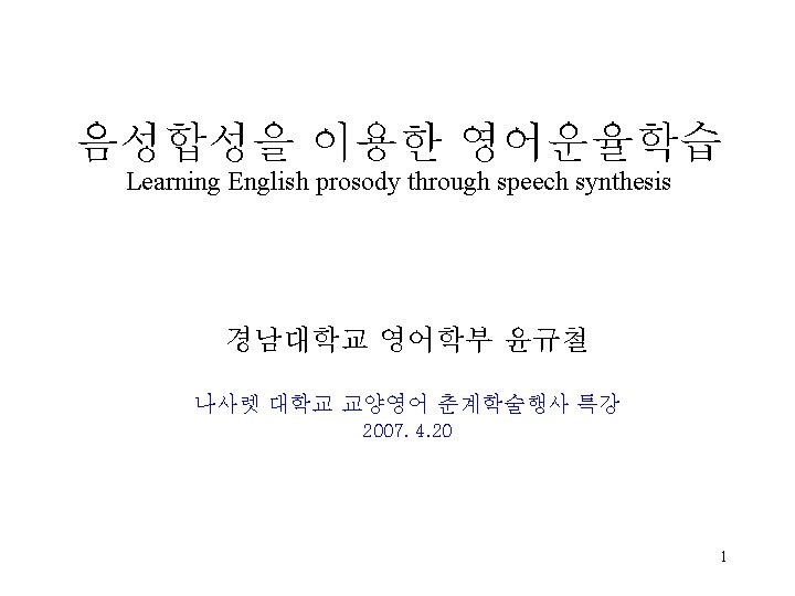 References [1] E. Moulines and F. Charpentier (1990) “Pitch synchronous waveform processing techniques for text-to-speech synthesis using diphones” Speech Communication 9, 453 -467. [2] P. Boersma (2005) “Praat, a system for doing phonetics by computer”, Glot International, Vol. 5(9/10), pp. 341 -345. [3] S. Yi (2007) “Perception of English prosody by Americans and Koreans and its pedagogical implications”, Ph. D. Dissertation, Busan: Pusan National University. [4] K. Yoon (2006) “Imposing native speakers’ prosody on non-native speakers’ utterances”, Proceedings of the 9 th Western Pacific Acoustics Conference (WESPAC 9), Seoul, South Korea. 30