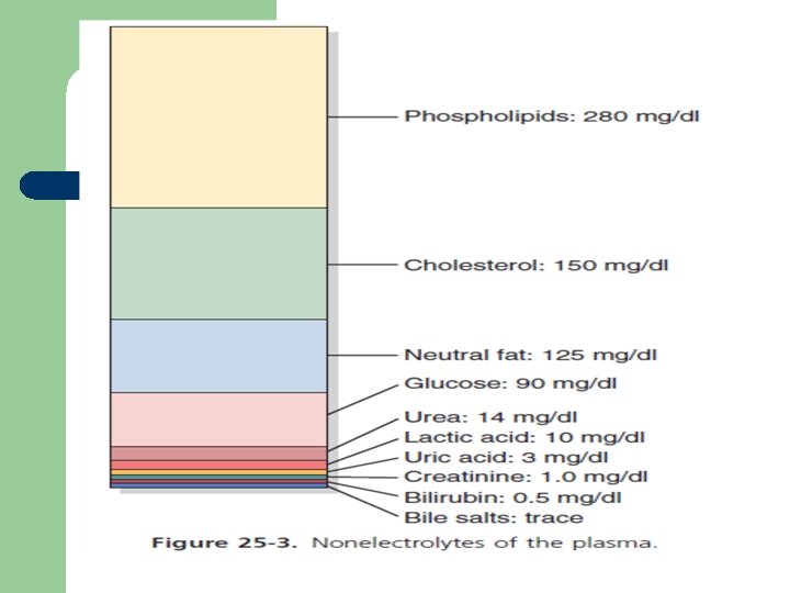 Plasma Composition l l Plasma proteins have a net negative charge, so it bind cations ( Na+, K+ ). Molecules that are being carried by plasma proteins will have: Ø More solubility. Ø Longer half life.
