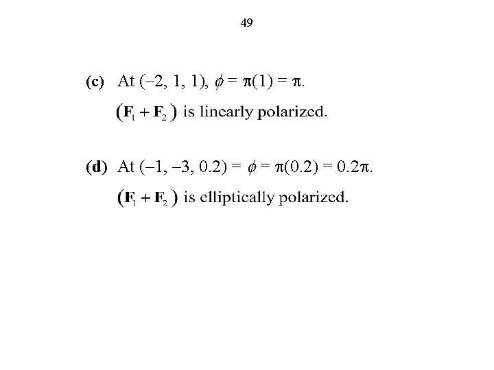 48 D 3. 17 F 1 and F 2 are equal in amplitude (= F 0) and differ in direction by 90˚. The phase difference (say f) depends on z in the manner – 2 pz – (– 3 pz) = pz. (a) At (3, 4, 0), f = p(0) = 0. (b) At (3, – 2, 0. 5), f = p(0. 5) = 0. 5 p.
