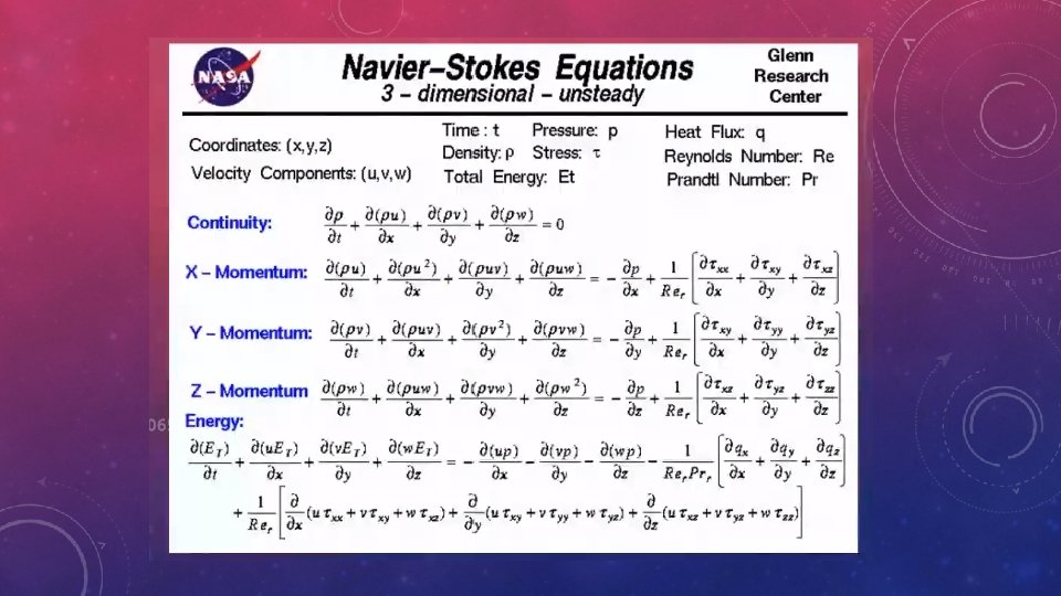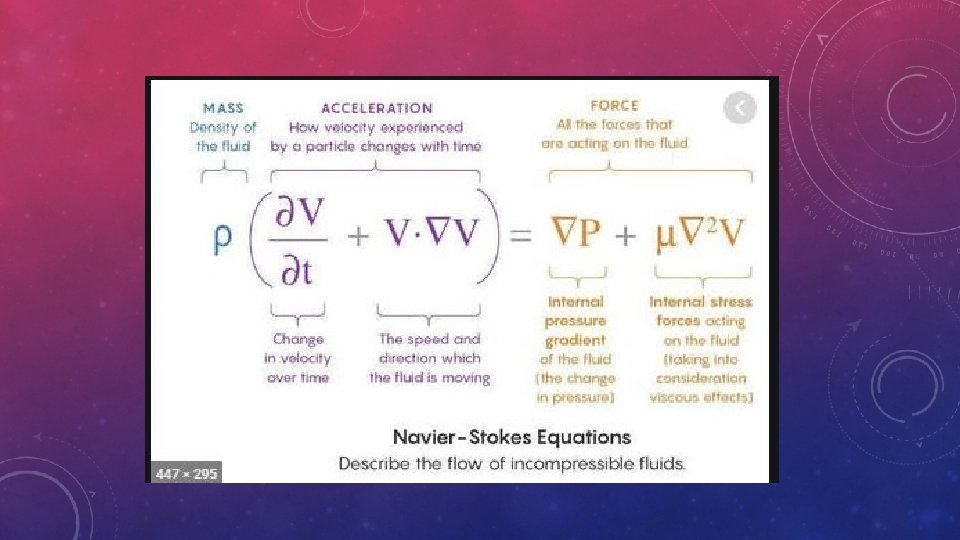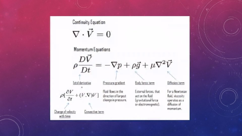 NAVIER–STOKES EQUATIONS • Differential equations of fluid motion Namely, conservation of mass (the continuity equation) and Newton’s second law (the Navier–Stokes equation) • Equations apply to every point in the flow field and thus enable us to solve for all details of the flow everywhere in the flow domain.