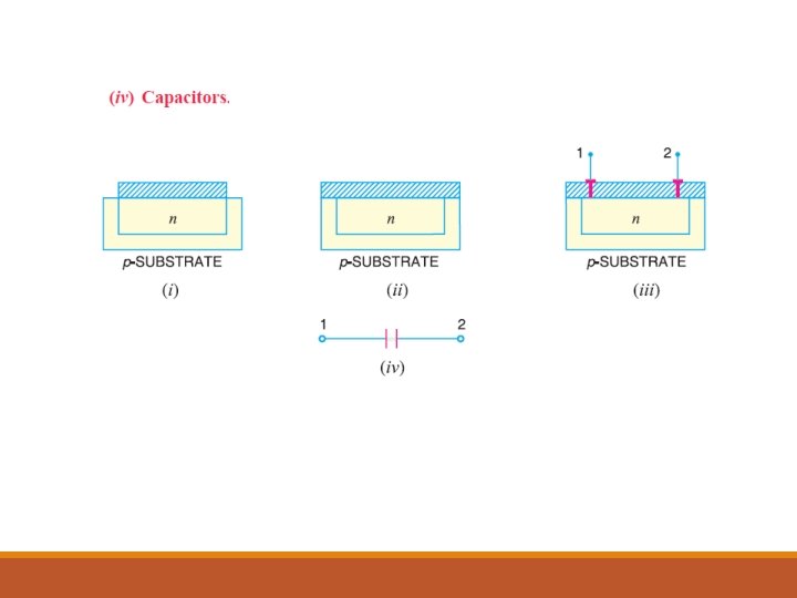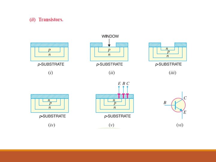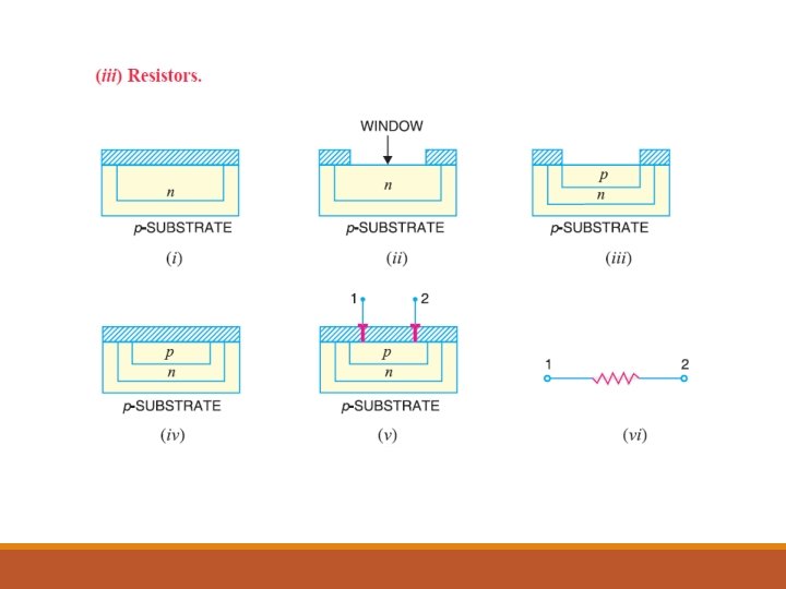 Fabrication of Components on Monolithic IC The wafer is then put into a furnace and trivalent atoms are diffused into the epitaxial layer. The trivalent atoms change the exposed epitaxial layer from n-type semi-conductor to p-type. Thus we get an island of n-type material under the Si. O 2 layer as shown in Fig. 23. 5 (ii).
