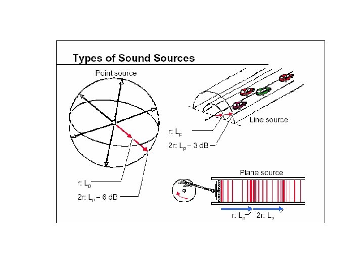 Line Source (Long trains, steady stream of traffic, long straight run of pipeline) If the source is located on ground, and has acoustic power output of W per unit length radiating over half the cylinder Intensity at radius r, When distance doubles; 10 log 2 + 10 log r means 3 d. B difference in the Sound Intensity Level