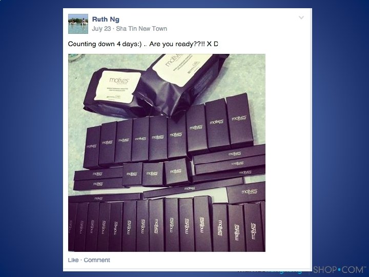零售 Retailing = Re-telling 零售 = 重覆說話內容 Re-telling on Facebook 重覆在Facebook和 and Instagram刊登的內容 Key is to be yourself 重點是做回你自己 Share your experience 分享你個人經驗 Put yourself in your 將心比己 audiences’ shoes 最重要是自己先做� Most important is 品的代言人 to “be a product of the product”