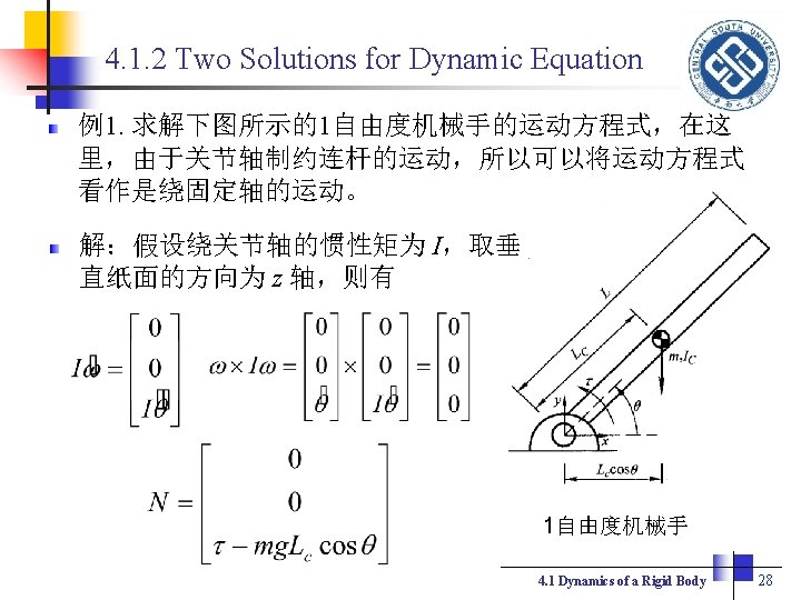 4. 1. 2 Two Solutions for Dynamic Equation Newton-Euler Dynamic Formulation (Newton Equation) (Euler Equation) where m is the mass of a rigid body, represent inertia tensor, FC is the external force on the center of gravity, N is the torque on the rigid body, v. C represent the translational velocity, while ω is the angular velocity. 4. 1 Dynamics of a Rigid Body 27
