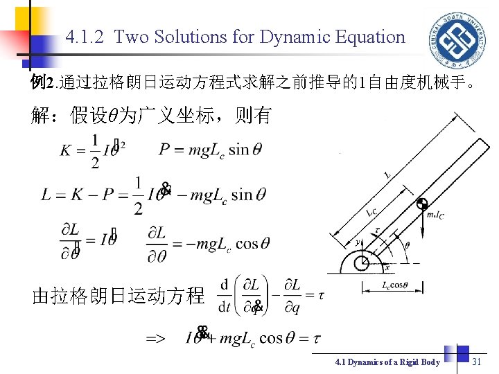 4. 1. 2 Two Solutions for Dynamic Equation Langrangian Function L is defined as: Kinetic Energy Potential Energy Dynamic Equation of the system (Langrangian Equation): where qi is the generalized coordinates, represent corresponding velocity, Fi stand for corresponding torque or force on the ith coordinate. 4. 1 Dynamics of a Rigid Body 30