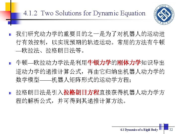 4. 1. 2 Two Solutions for Dynamic Equation Newton-Euler Dynamic Formulation Rotational Motion Angular Momentum 4. 1 Dynamics of a Rigid Body 25