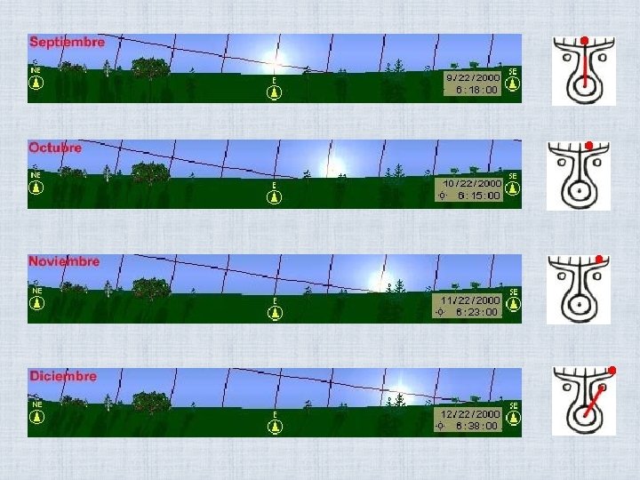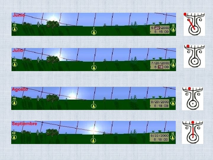 DESDE UNA LOCALIDAD FIJA CUALQUIERA SE VERÁ AL SOL SESPLAZARCE DÍA A DÍA SOBRE LA LÍNEA DEL HORIZONTE, DE MODO QUE ESE HORIZONTE SE CONVERTIRÍA EN UN CALENDARIO SOLAR Solsticio de diciembre Solstcio de junio Equinoccio
