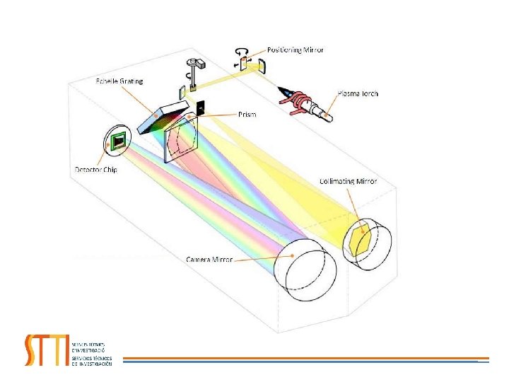 ESPECTRÓMETRO VISIÓN AXIAL El camino óptico de la emisión es mayor que en el plasma observado radialmente Se mejora la sensibilidad y los LOD La visión axial no extiende el rango dinámico lineal sino que lo desplaza a concentraciones menores