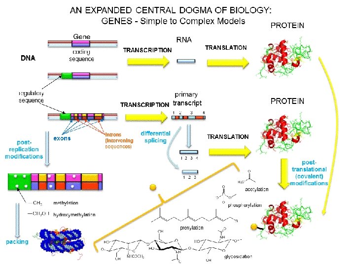 l CAAT BOX e GC BOX podem reprimir ou ativar a expressão do gene. l O processo de expressão gênica apresenta duas grandes fases. l 1ª FASE - transcrição: síntese de m. RNA copiado do molde de DNA. l 2ª FASE - tradução: ribossomos(citoplasma). l Genes eucarióticos possuem regiões codificadoras exons e não codificadoras introns. l Pré-m. RNA sofre processamento com retirada de seqüências introns. l A seguir ocorre a tradução no RE. síntese de proteínas nos
