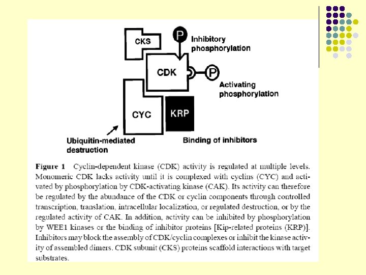 Regulação de atividade de CDKS: l 1) l 2) Síntese de proteínas ciclinas. Destruição de ciclinas pela ubiquitina no proteossomo 26 S. l 3) Fosforilação e desfosforilação de resíduos de aminoácidos na molécula de CDK pelas fosfatases. l. Mudança de G 1 para S necessita de ciclinas TIPO G. l. Mudança de G 2 para M necessita de ciclinas mitóticas. l. Fosforilação de algumas moléculas de tirosinas das CDKs faz a ativação. l. Outras atividade. moléculas de tirosinas ao se fosforilarem inibem