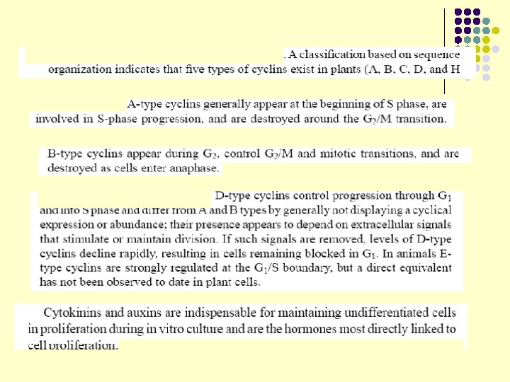 Controle do ciclo celular l Os hormônios vegetais estão também envolvidos no controle do ciclo celular. l Fases do ciclo celular : G 1, S e G 2 (interfase); M (mitose). l G 1 é o START: preparação para duplicação de DNA nuclear, pelo complexo de pré-replicação de cromatina. l S: DNA replicado. l G 2 : preparo para mitose. l Enzimas que controlam transição do ciclo celular: proteínas quinases dependentes de proteínas ciclinas (CDKS). l Hormônios vegetais induzem a expressão gênica de CDKs e ciclinas. l CDK fazem transição de G 1 para S e de G 2 para M (mitose).