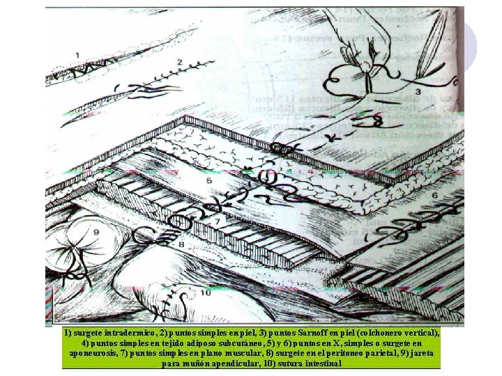 TIEMPOS FUNDAMENTALES DE TECNICA OPERATORIA INSTRUMENTAL DE SUTURA O SINTESIS l En el cierre o sutura de las heridas se pueden emplear diferentes tipos de puntos, dependiendo de la clase de tejidos, así como de su localización: l Sutura de la herida por puntos separados: ¡ Puntos Simples. Cierre de cualquier tipo de herida, se colocan con una separación de 7 a 10 mm de un punto a otro y a 4 mm de los bordes ¡ Punto en U ( colchonero). Es un punto hemostático por eso se emplea en vísceras macizas ( hígado). No es estético. ¡ Puntos en X / Punto Cruzado. Es hemostático por excelencia. Se emplea en aponeurosis y cuero cabelludo ¡ Puntos de Pack. Es un punto que permite un buen afrontamiento de los bordes, los riesgos de cabalgamiento están minimizados.