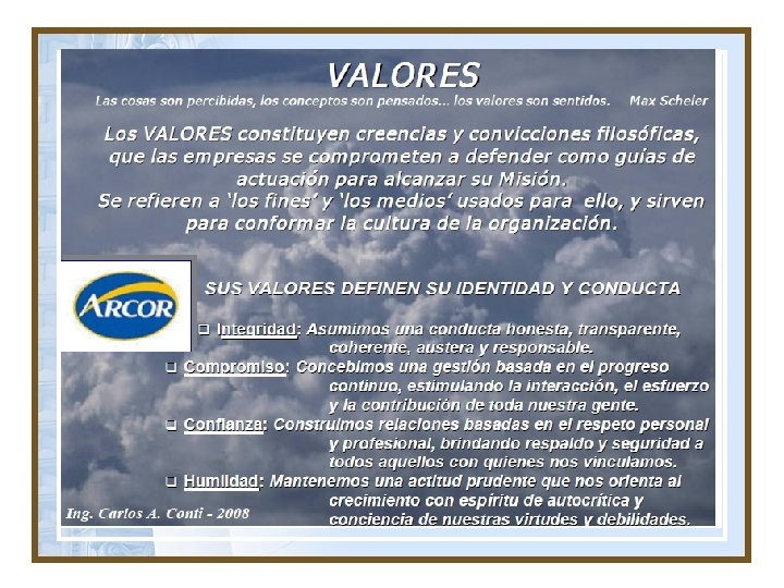Valores Los valores llamados tambien principios corporativos representan las convicciones, principios, el conjunto de creencias y reglas de conducta personal de las personas encargadas de dirigir la empresa y que regulan la vida de una organización. Los valores definen la personalidad de la organización. establecen los límites entre los cuales se pueden mover los actores y sus restricciones.