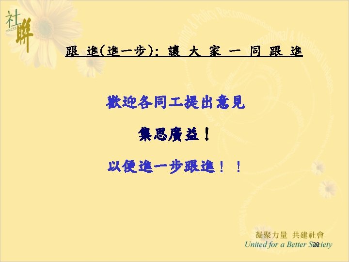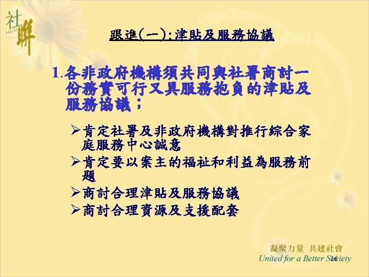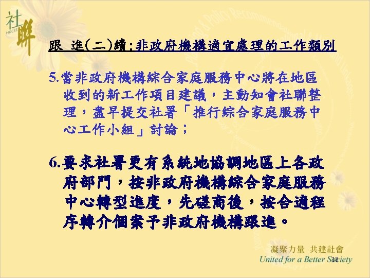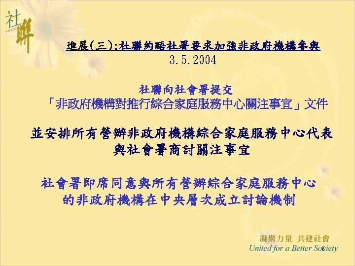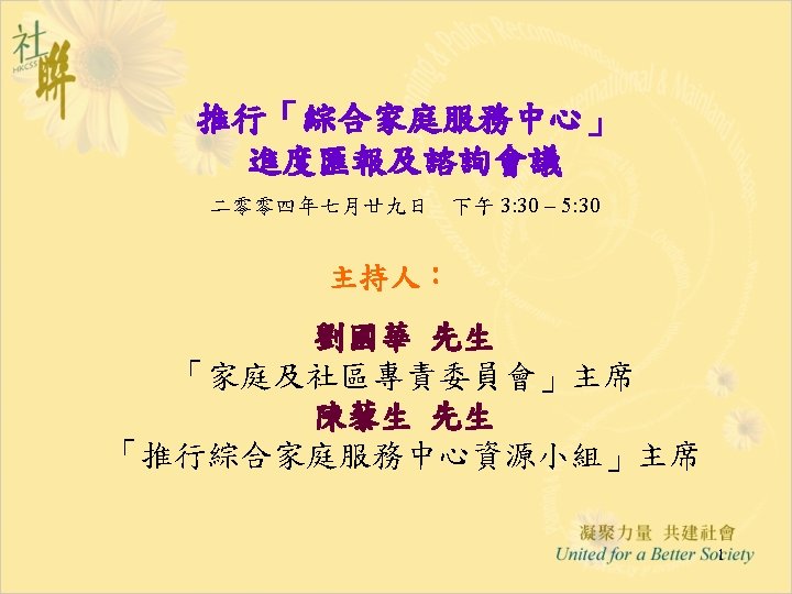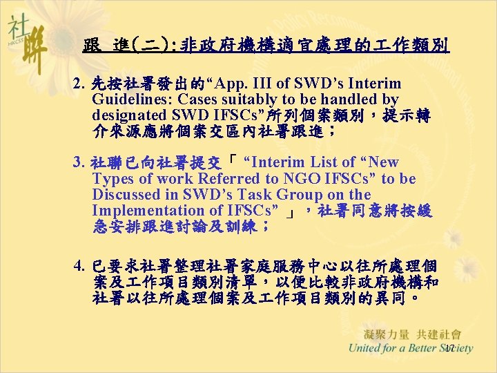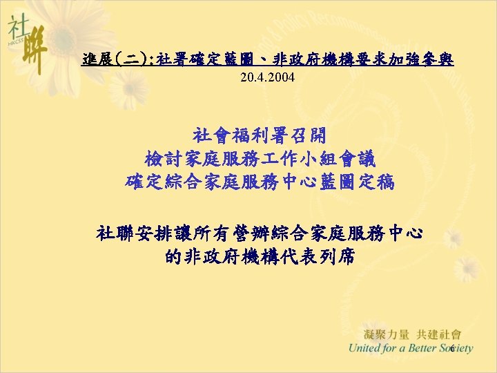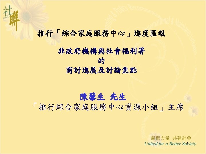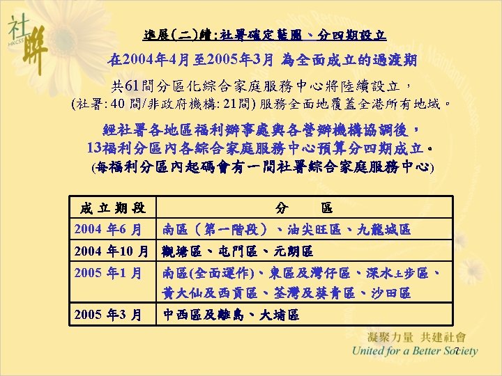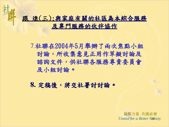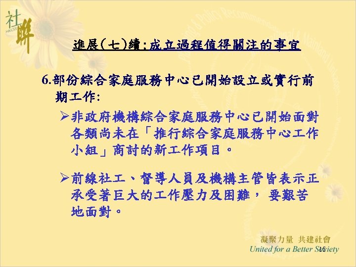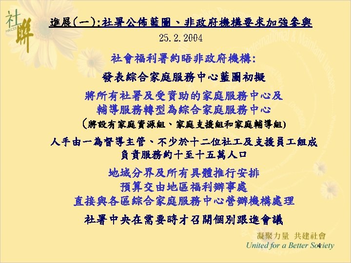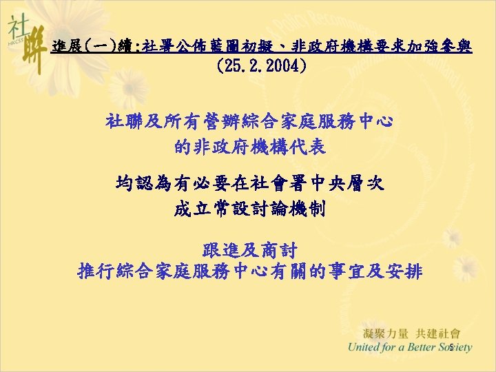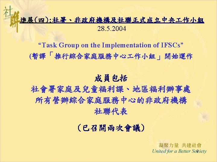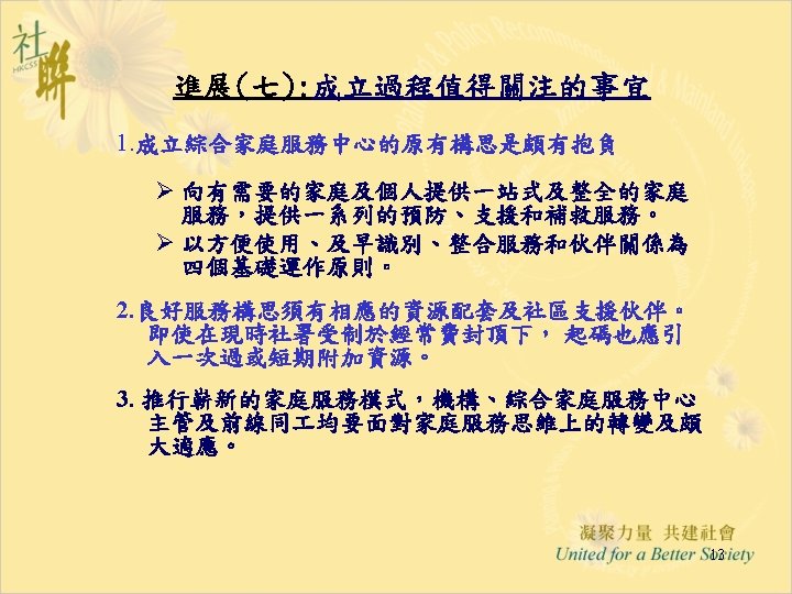 進展(六): 「推行綜合家庭服務中心 作小組商議進展」 28. 5. 2004 • Funding & Service Agreement on IFSC (First Discussion Draft) Ø To delete wordings of “These agreed levels of Output Indicators are minimum requirements only” from the Draft FSA; Ø Feasibility and suitability of the proposed target to operate 15 sessions per week needed to be reviewed • Output Indicators: Ø Increase Flexibility by Combining Output Indicators into Clusters; • Agency-based FSA: Ø The FSA per each IFSC will be worked out first; Ø For agencies with two or more IFSCs, the total agency output can be shared by all the IFSCs in the same NGO. • Reasonable Workload for NGO IFSC with 12 -14 RSWs is requested and needed to be discussed in next Task Group meetings. 12