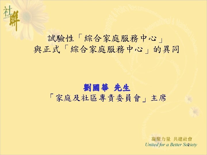 進展(五)續: 「推行綜合家庭服務中心 作小組」 已提出商議事項清單 • Operational Issues: Ø Handing of Housing Cases Ø Use of Forms (Case Screening Form, Target Problem Rating Form and User Satisfaction Survey) Ø Handling of Referrals from Leg. Co Members, D. C. members, CE Offices, etc. Ø Debriefing Service for the Needy in Disaster/Tragedies • Clinical Psychological Service for Cases of NGO IFSCs • Collaboration/Division of Labour between IFSC and Integrated Services run by 3 NGOs • Interfacing issues between IFSC and other communitybased services • Manual of Procedures for IFSC (for both SWD and subvented sector) 11