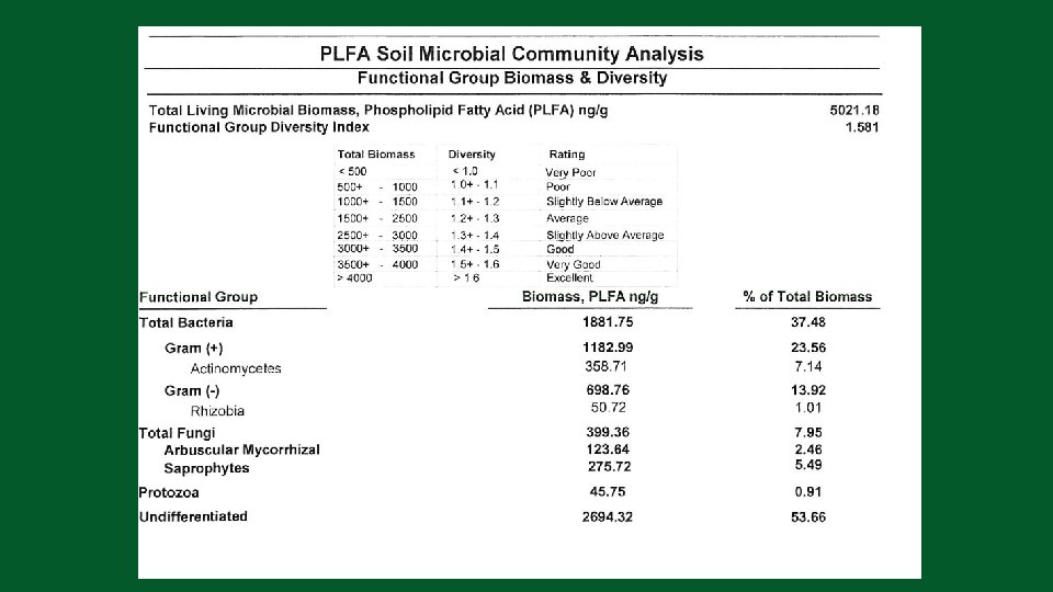 Biological Indicators SMB (lbs/ton) A B 3000 2500 2000 1500 1000 500 0 2 Yr CC 10 Yr Hay LT CC Total Soil Microbial Biomass C BR (lbs/ton/day) A B C q. CO 2 (mg/g/day) 50 50 40 40 30 30 20 20 10 10 0 0 2 Yr CC 10 Yr Hay LT CC Microbial basal respiration 2 Yr CC 10 Yr Hay LT CC A B C LT CC Specific maintenance respiration (C catabolized per unit of microbes) Analysis by OSU Lab