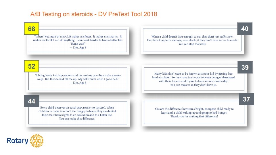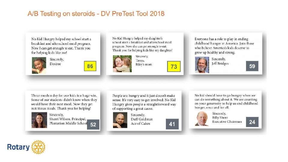 DONORCENTRIC COMMUNICATION Donor is hero! Not your club. § “Your gift gave _____ to ____. ” Not § “Your gift allowed us to give _______ to ______. ”