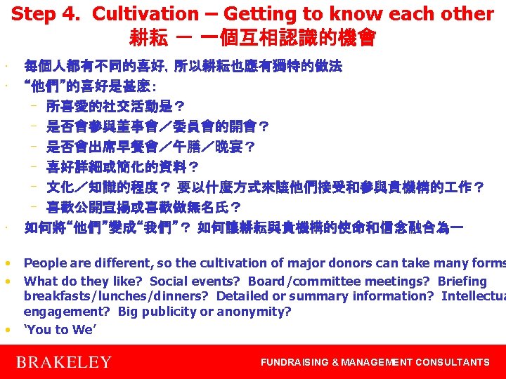 Step 3. Plan Cultivation – What are you going to do with them? 耕耘計劃的策劃 • • 策劃是成敗的關鍵 詳細寫下應如何去聯絡所有認定是潛在大額捐助者的步驟: – 應邀請哪位董事/資深職員的參與; – 應邀捐助者參與哪些活動; – 從調�中瞭解,捐助者應該會對哪方面的機構服務/ 作範圍有興趣,等等。 • 計劃應保持靈活以迎合隨時可變化的培育過程 • Planning is the key to success in fundraising • For all prospects identified as major donors, write down what steps you are going to take to get close to them – which Board members/senior staff will be involved – which events you will invite them to – what area you think they will be interested in, based on your research • BUT… be flexible, the plan will change as you proceed through cultivation FUNDRAISING & MANAGEMENT CONSULTANTS
