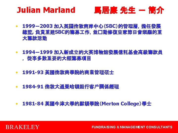 Julian Marland 馬居廉 先生 - 簡介 • Managing Director, Brakeley Asia since February 2007, living in Hong Kong since Aug 08 • With Brakeley since September 2003; clients include: Moscow School of Management, Skolkovo; NTU, Singapore; Western Academy Beijing; Salzburg Festival; National Library of Scotland; Green College, Oxford; Hong Kong Academy; Gothenburg SO; Nationale Reisopera (NL); VSO, London; WWF Singapore; UNAIDS China; British School, Delhi • Development Director, South Bank Centre, 1999 -2003 • Major Gifts Officer, British Museum, 1994 -99 • MBA, London Business School, 1991 -93 • Relationship Manager, Chase Manhattan Bank, London, 1984 -91 FUNDRAISING & MANAGEMENT CONSULTANTS