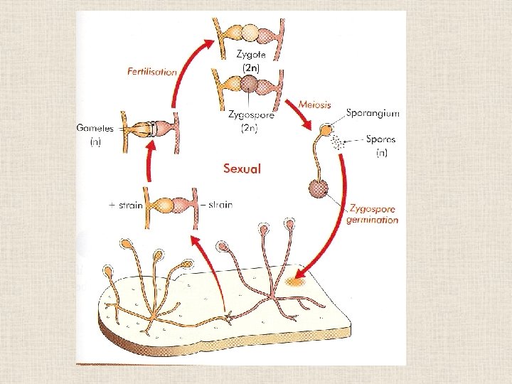 Sexual reproduction 6. A tough walled, zygospore forms around these nuclei. 7. When conditions are suitable the zygospore germinates by meiosis. + Strain - Strain