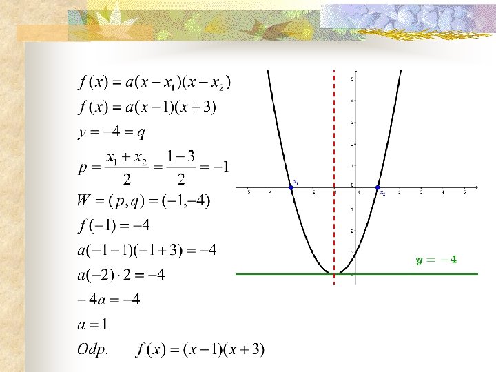 Przykład 3 Dane są dwa miejsca zerowe funkcji 1 i – 3 oraz jej wykresem jest parabola styczna do prostej o równaniu y = – 4. - należy zatem skorzystać z postaci iloczynowej funkcji kwadratowej, bo znamy miejsca zerowe