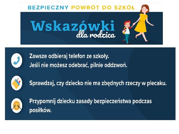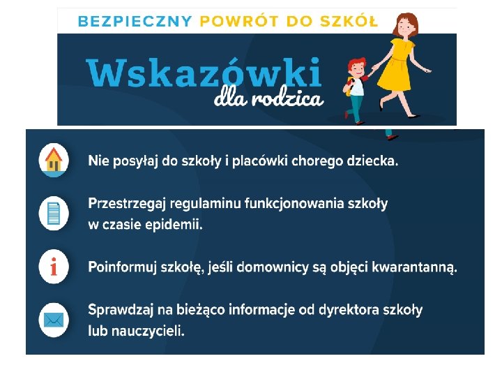 Zasady obowiązujące w naszej szkole. • w świetlicy mogą przebywać tylko uczniowie dojeżdżający oraz ci, których oboje rodzice pracują zawodowo i żaden z rodziców nie może w godzinach od 7. 30 do 16. 30 sprawować opieki nad dzieckiem/dziećmi • wychowawcy muszą przekazać dyrektorowi wykaz aktualnych numerów telefonicznych do obojga rodziców uczniów, • wychowawcy poproszą rodziców/opiekunów o wypełnienie deklaracji i zgody na pomiar temperatury ciała dziecka w przypadku zauważenia u niego przejawów choroby zakaźnej, • uczeń, u którego zauważone zostaną objawy: podwyższona temperatura, kaszel, ogólne zmęczenie, zostanie umieszczony w izolatce szkolnej