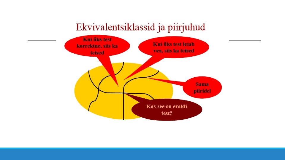 Soovitused q Kui piir on ujukomaarv, siis tuleb testid valida sellelt piirilt, sellest veidi suuremad väärtused ja väiksemad väärtused. Ujukomaarvude puhul on võimatu määrata täpset arvu, seetõttu ka täpset piiri. Lähtuda saab vaid teatud täpsusest. q Kui ülemist (alumist) piiri pole antud (tõkestamata vahemik), tuleb testiks valida absoluutväätuselt väga suur positiivne või negatiivne arv. q Kui piiriks on täisarv N, tuleb testideks valida väärtused N, N-1, N+1 - st täpselt piiril olev arv, eelmine arv ja järgmine arv. Täisarvude puhul (erinevalt ujukomaarvudest) on alati võimalik määrata eelnev ja järgnev väärtus. q Kui sisendandmeteks on järjestamata hulgad, siis piirolukordi ei teki.
