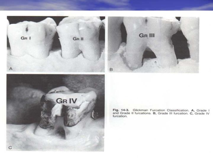 • Class III : more than 6 mm of horizontal invasion. ( Denotes furcal invasion half the distance from the buccal surface to the lingual surface) R • Too deep to resolve by odontoplasty and must be considered a candidate for periodontal regeneration , maintained as is, or hemisection.