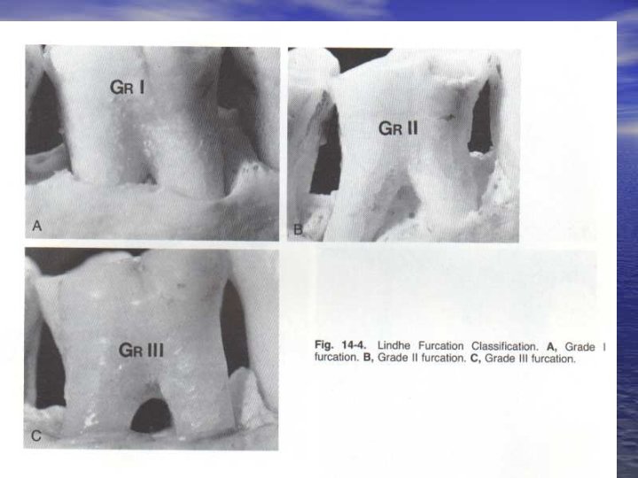 Lindhe (1983) Grade I (initial) –loss of interradicular bone less than or equal to one-third. Grade II (partial) – loss of interradicular bone greater than one-third but not through and through. Grade III (total) – through and through loss of interradicular bone.