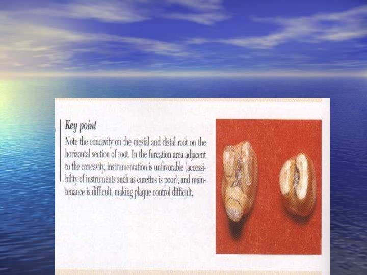 • The mesial root has greater surface area than the distal root. It has an hour-glass cross-section , which may make selfperformed plaque control and restorative procedure difficult. • The distal root is oval shaped and large, providing a greater mass of dentin to resist root fracture (Langer et al 1981), and is a good candidate for pin or post plaement. Also, in case of an terminal abutment for a bridge, retension of the distal root will result in a longer arch.