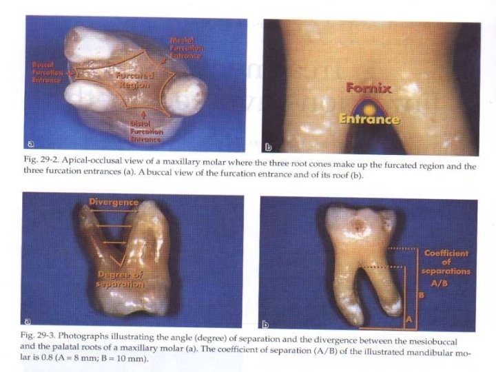 • The furcation is the area located between • • • individual root cones. Furcation entrance is the transitional area between the undivided and the divided parts of the root. Furcation fornix is the roof of the furcation. Degree of separation is the angle of seperation between two roots (cones). Divergence is the distance between two roots. Coefficient of separation is the length of the root cones in relation to the length of the root complex