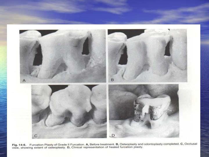 Furcation plasty –Odontoplasy and Osteoplasty • Described by Hamp, Nyman and Lindhe (1975) • It is a resective treatment modality which should lead to the elimination of the interradicular defect. Tooth substance is removed (odontoplasty) and the alveolar bone crust is remodeled (osteoplasty) at the level of the furcation entrance. Used mainly at buccal and lingual furcations.