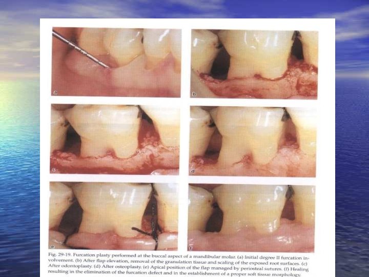 Procedure • Reflect buccal and lingual mucosal flap and • • remove the granulation tissue. The furcation area is widened by removal of some of the interradicular bone. The alveolar bone crest is recontoured to obtain a flat outline of the bone, some of the interdental bone, mesial and distal to the tooth in the region, is also removed. Following hard tissue resection enough space is established in the furcation area to allow for access for cleaning devices. The flap is repositioned apically to the surgically established interradicular and Interproximal bone level.