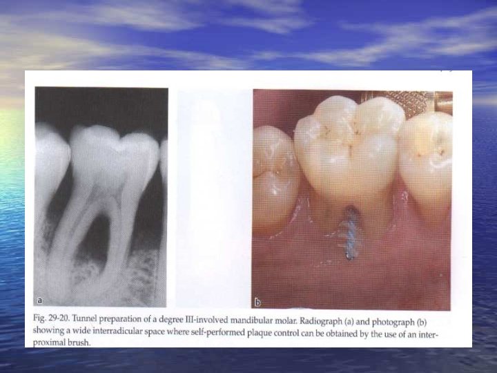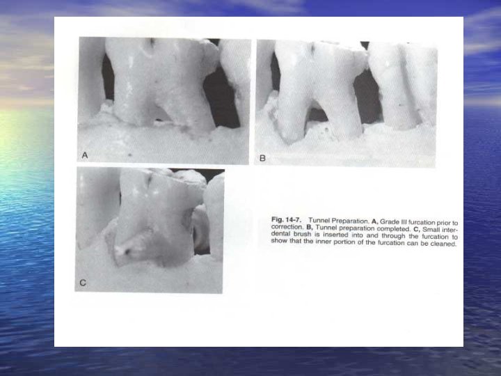 • In cases where the involvement extends deeper into the furcation area (>5 mm; degree II) or through and through defect (degree III involvement) has developed , tunnel preparation or root resection has been advocated as choice of treatment (Muller 1995)