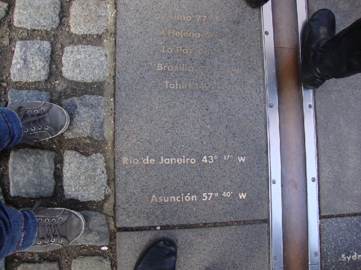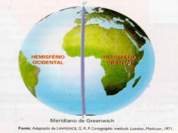 O meridiano de Greenwich Divide a Terra de forma perpendicular, e formando duas partes, denominadas de oriente e ocidente. O meridiano de Greenwich foi internacionalizado como referencia mundial para a construção e padronização de horários, esse meridiano teve sua consolidação a partir de um acordo mundial acerca da hora e data adotada no mundo. A nomeação do meridiano é proveniente do Observatório Astronômico Real, localizado em um distrito de Londres chamado de Greenwich, que corta o observatório.
