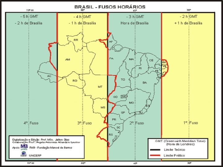 Tipos de hora: Hora legal – tem por base o meridiano de Greenwich. Hora local – é determinada pelo movimento aparente do Sol. Horário de verão: é adotado nas regiões de médias latitudes no período de maior insolação (verão) com o objetivo de reduzir o consumo de energia. (diminui 1 hora)