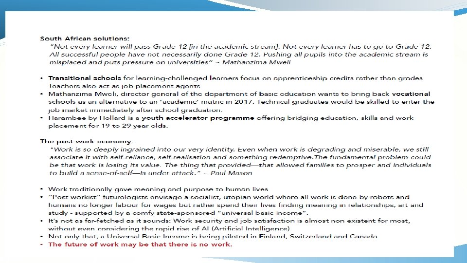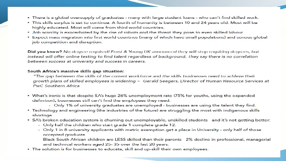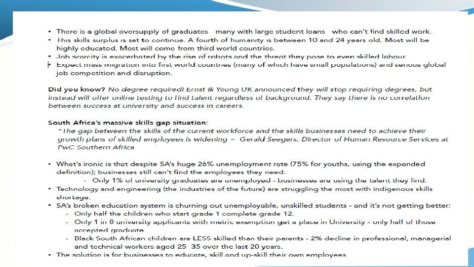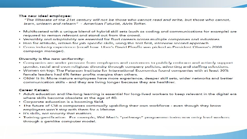 Skills of the Future Fundamental Skills Abilities Cognitive Content Skills Cognitive flexibility Creativity Logical reasoning Problem sensitivity Mathematical reasoning • Visualisation • • • Active learning Oral expression Written expression Reading comprehension Basic digital literacy Cross Functional Skills Social Skills • • • Collaborating (5 basic) Emotional intelligence Influencing Service Orientation Sharing Change Management • Managing financial results • Managing material resources • Managing people • Managing time Process Physical • Physical Strength • Dexterity and recision Mental • Happiness • Energy 2 Presentation name • • • Active listening Critical thinking Self- monitoring Monitoring Transdisciplinarity Technical Skills • Equipment maintenance and repair • Equipment operational control • Quality control • Slide 4 | 24 February 2021 | Slide No. 2 Leadership Servant Leadership: • Whole leadership • Business acumen • Technical ability • Relationship building • Global acumen Digital Leadership: • Balance growth & risk • Create virtuous circle of customer engagement • Rethink products and business models • Innovate Digital Skills • Robotics • Application Development • Design Thinking • User Interface Design (UI) • User Experience Design (UX) • Social Media Customer Services • Digital Innovation • Cyber/Digital Security • Data Architecture/Enginee ring • Data Security • Data Storage • Data Management • Data Mining • Data Analytics • Agile • Coding