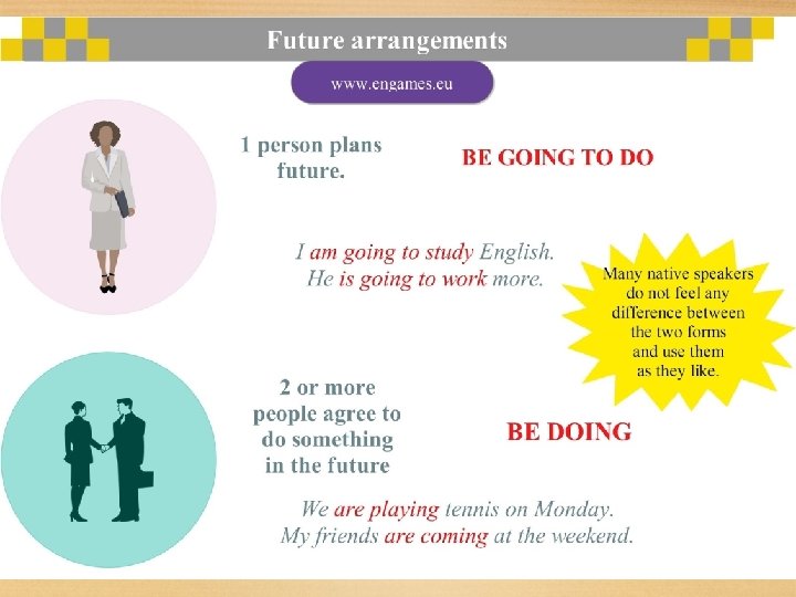 Present arrangement or future arrangement • You have to pay attention to the context or the time expression used in the sentence. Present arrangement Future arrangement At the moment Next week / month / year Right now Tonight / this morning / this afternoon / tomorrow Look! Listen! This week / month / year Later / on Monday / in December