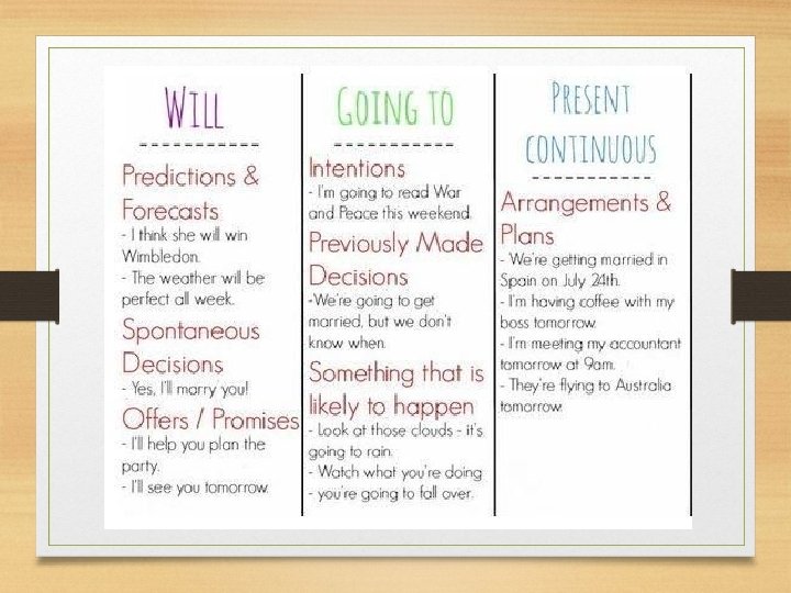 Be going to • It is used for intentions. For example: • Mary is going to be a doctor. • It is also used in predictions based on evidence or something likely to happen. For example: • Her shoes are untied! She is going to fall down. • It is used with previously made decisions. For example: • A: Mary is getting married this month. • B: I know. I’m going to buy her a present.