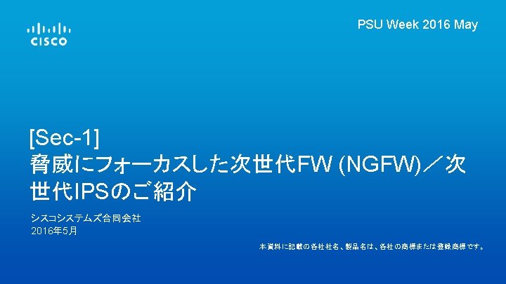 アジェンダ • 次世代FW/次世代IPS - Firepower Threat Defense (FTD) • 次世代セキュリティ プラットフォーム - • Firepower 9300 / 4100 シリーズ ユース ケース © 2016 Cisco and/or its affiliates. All rights reserved. Cisco Confidential 2