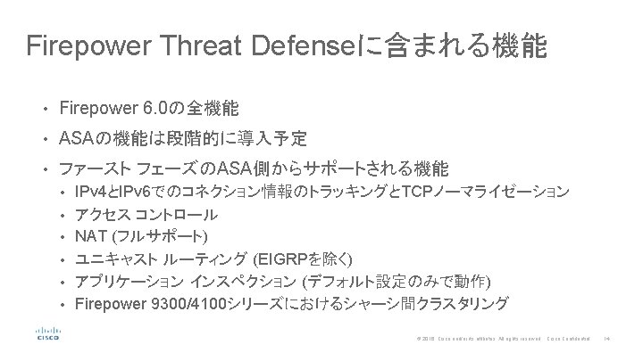 Firepower Threat Defenseの長所 (ASA with FPとの比較) ASA with Firepower servicesでは… • 2つのイメージのデプロイが必要 • 1つのハードウェア内で 2つのOSが動作 • パケットが仮想的にイメージ間を移動 • 機能の重複がある(ASAとFire. POWER) • 2種類の管理サーバ CSM: ASA, Fire. SIGHT: Fire. POWER ASA CSM Fire. SIGHT © 2016 Cisco and/or its affiliates. All rights reserved. Cisco Confidential 13