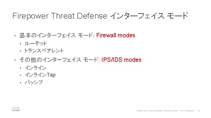 Firepower Threat Defense デプロイメント • FTD は、各々のインターフェイス上で NGFW か NGIPS が可能 NGFW は、ASAのモード(Routed、トランス ペアレント)継承とFire. POWERの機能が追加 • NGIPS は、スタンドアロン Fire. POWER 機能と制限されたASA データ プレーン 機能 • NGIPS NGFW Routed 10. 1. 1. 0/24 inside FTD 10. 1. 2. 0/24 outside DMZ 10. 1. 3. 0/24 Transparent inside FTD DMZ Inline outside 10. 1. 1. 0/24 Inline Tap Passive Eth 1/1 FTD Eth 1/2 FTD © 2016 Cisco and/or its affiliates. All rights reserved. Cisco Confidential 17