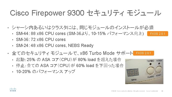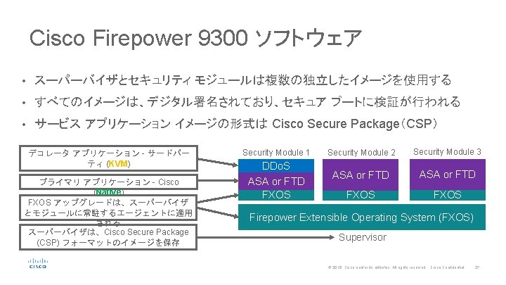 セキュリティ モジュール ダイアグラム System Bus RAM x 86 CPU 1 24 or 36 cores x 86 CPU 2 24 or 36 cores Ethernet 2 x 100 Gbps Smart NIC and Crypto Accelerator 2 x 40 Gbps Backplane Supervisor Connection © 2016 Cisco and/or its affiliates. All rights reserved. Cisco Confidential 26