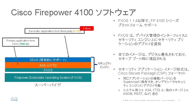 Cisco Firepower 4100 ロジカル ダイヤグラム RAM 4110: 64 Gb 4120: 128 Gb 4140: 256 Gb 4150: 256 Gb x 86 CPU 1 x 86 CPU 2 4110: 12 cores 4120: 12 cores 4140: 36 cores 4150: 44 cores 4110: N/A 4120: 12 cores 4140: 36 cores 4150: 44 cores System Bus RAM Ethernet 4110: 1 x 100 Gbps 4120 -4150: 2 x 100 Gbps Smart NIC and Crypto Accelerator 4110: 1 x 40 Gbps 4120 -4150: 2 x 40 Gbps Internal Switch Fabric (up to 18 x 40 GE) 2 x 40 Gbps x 86 CPU 5 x 40 Gbps On-board 8 x 10 GE interfaces 5 x 40 Gbps NM Slot 1 NM Slot 2 © 2016 Cisco and/or its affiliates. All rights reserved. Cisco Confidential 30