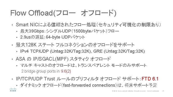 Flow Offloadの動き Extended Offload Path Full Inspection • フロー確率後、ダイナミックにオフロードエンジンにプログラム • 瞬時にフルインスペクションとオフロードを切り替え可能 • 高度な処理に対する専用の x 86 core • パケット キャプチャと拡張された統計情報 Security Module x 86 CPU Complex Full ASA or FTD Engine New and fully inspected flows Incoming traffic Offload instructions Flow Classifier Lightweight Data Path Flow updates Established trusted flows Advanced Processing Rewrite Engine Smart NIC Flow Offload • 制限されたステー ト トラッキング, NAT/PAT, TCP シーケンスのランダム化 • シングルUDPフローで 39 Gbps、 5 us以下の遅延、 32 K tracked flows © 2016 Cisco and/or its affiliates. All rights reserved. Cisco Confidential 38